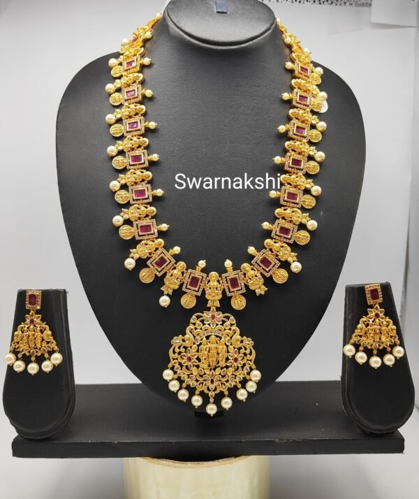 one gram gold long haram designs with cz ruby stone model long necklace