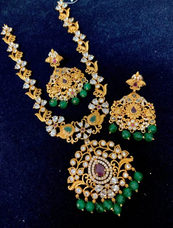 Ruby emerald long haram designs grand look model with big Jhumkas