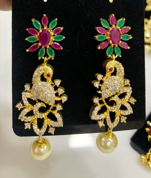 CZ earrings online ruby and emerald stones with peacock design