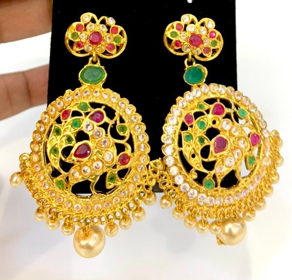 Be the first to review “CZ earrings online with emerald and ruby stones chandbali design”