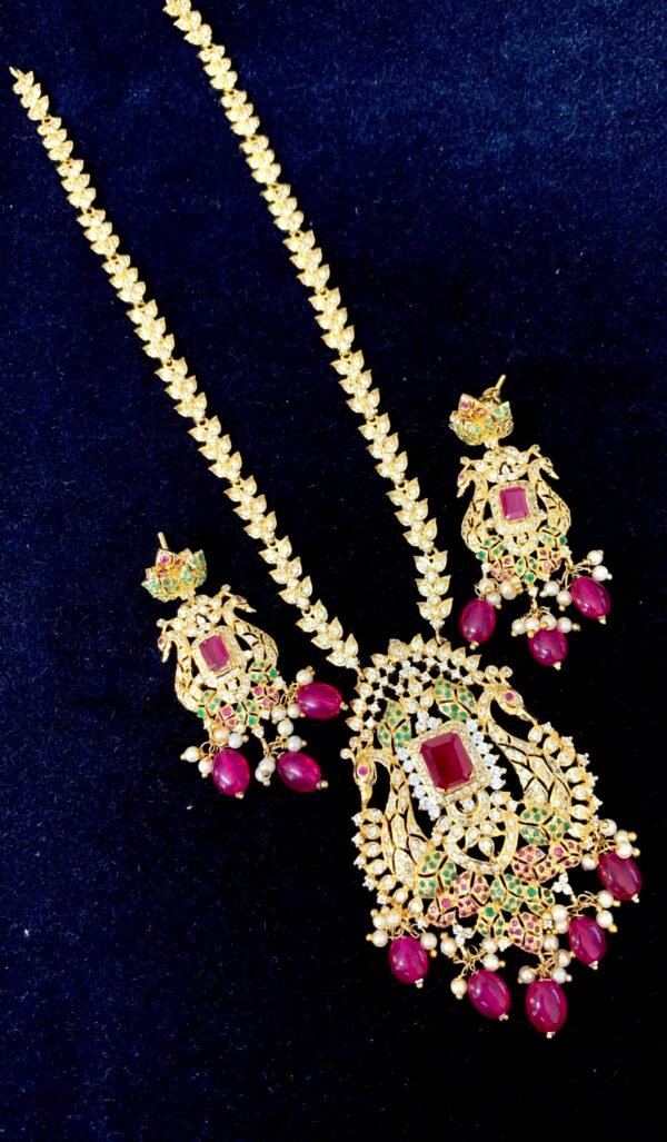 Item Description : CZ haram with big peacock pendant and earrings set