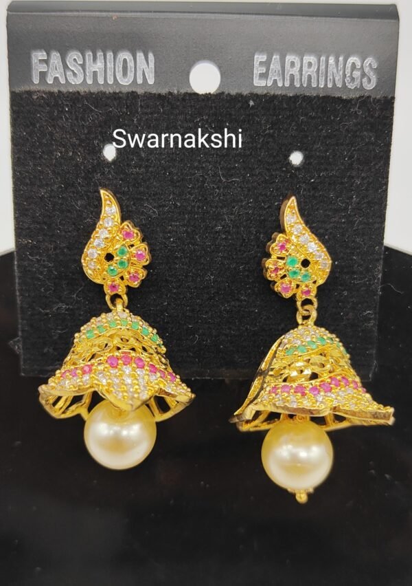 CZ stone jhumkas with ruby stones middle pearl model