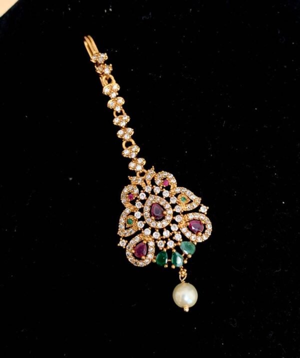 Be the first to review “CZ maang tikka online with ruby and emerald stone model”