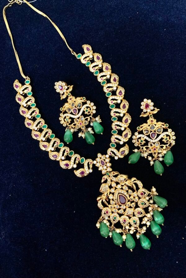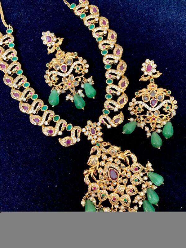 Item Description : CZ stone necklace sets with pearl and peacock pendant design