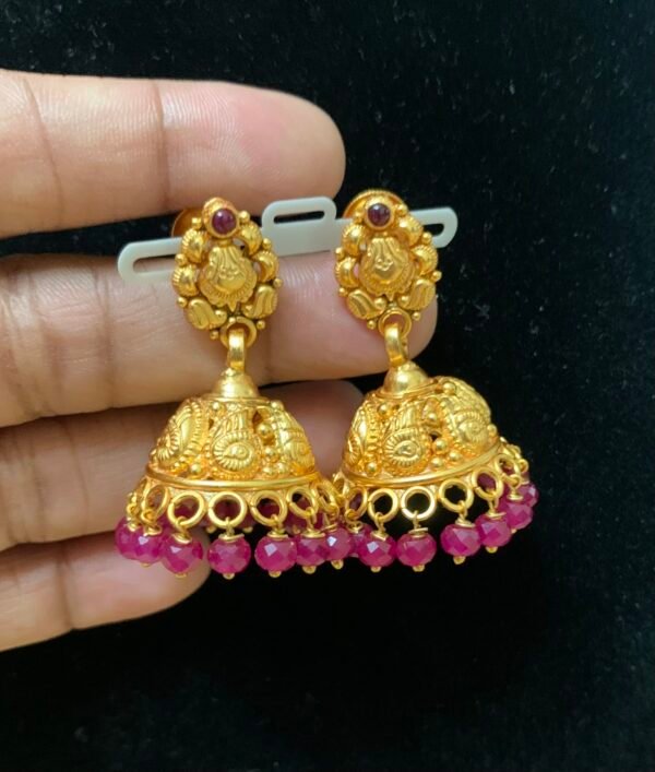 Gold plated silver Jhumkas for women With chatam ruby beads drop model