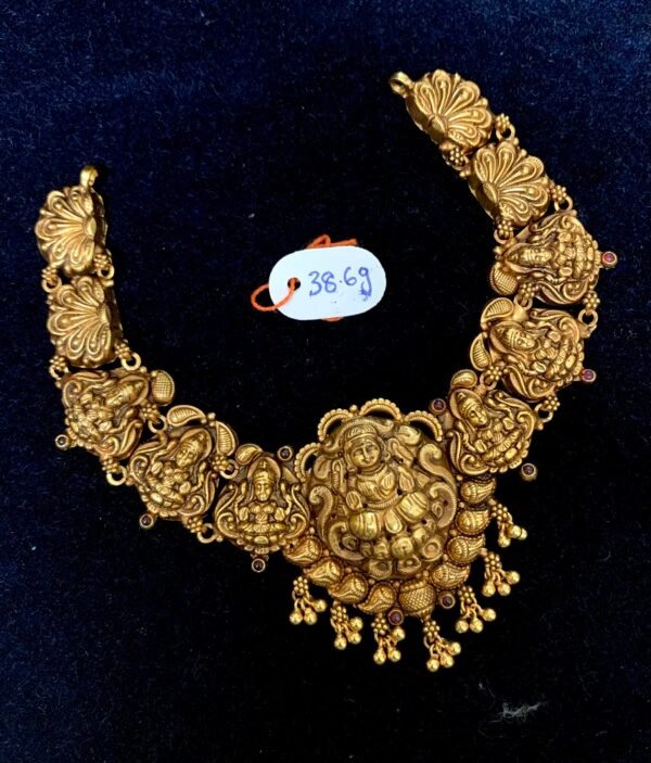 Item Description : 925 Silver Gold plated Necklace grand look, antique gold Lakshmi devi design with ball drops Design Type : Grand look Antique gold necklace