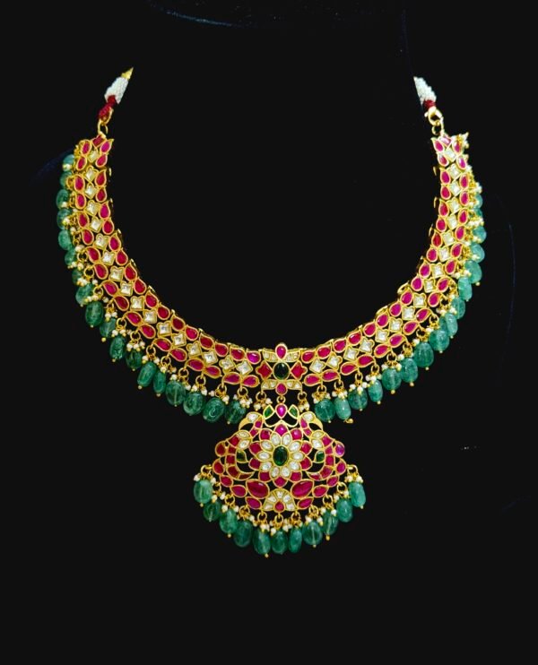 Grand kundan necklace set multi stones with green beads drop model