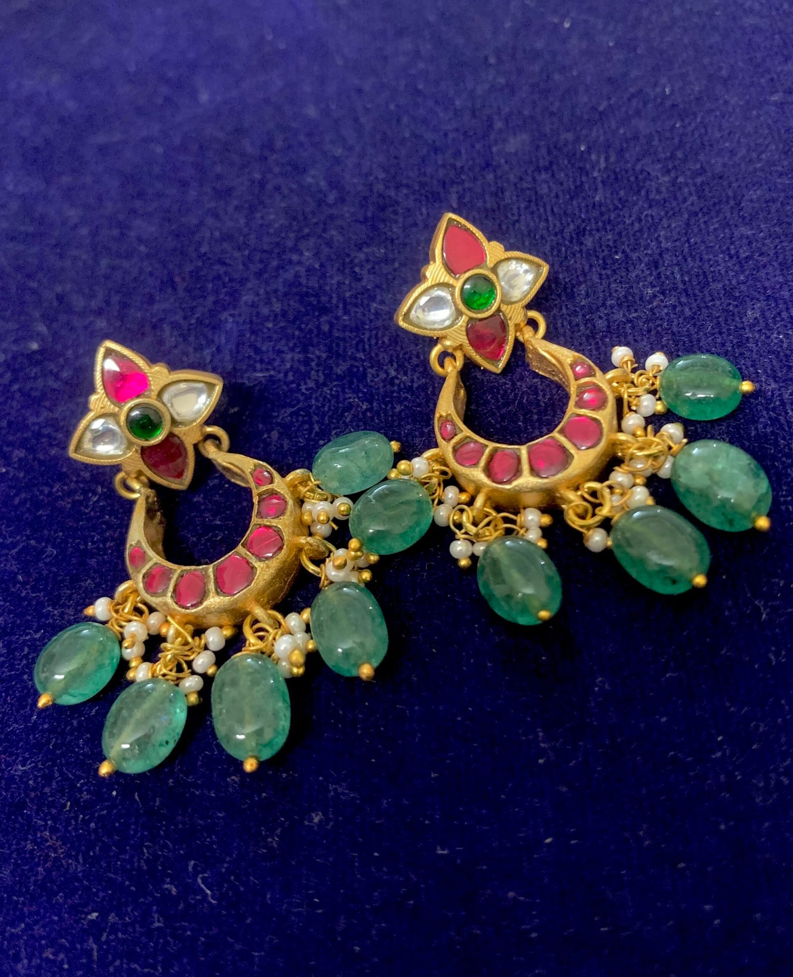 Be the first to review “Jadau kundan earrings green beads and pearls drop design trendy model”