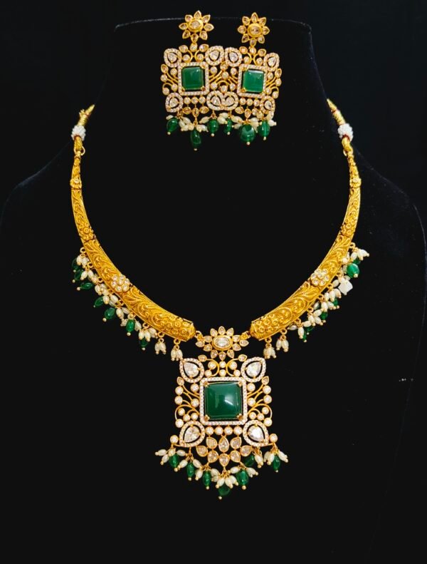 Be the first to review “kante style necklace Dark emerald stones with rice pearls drop grand model”
