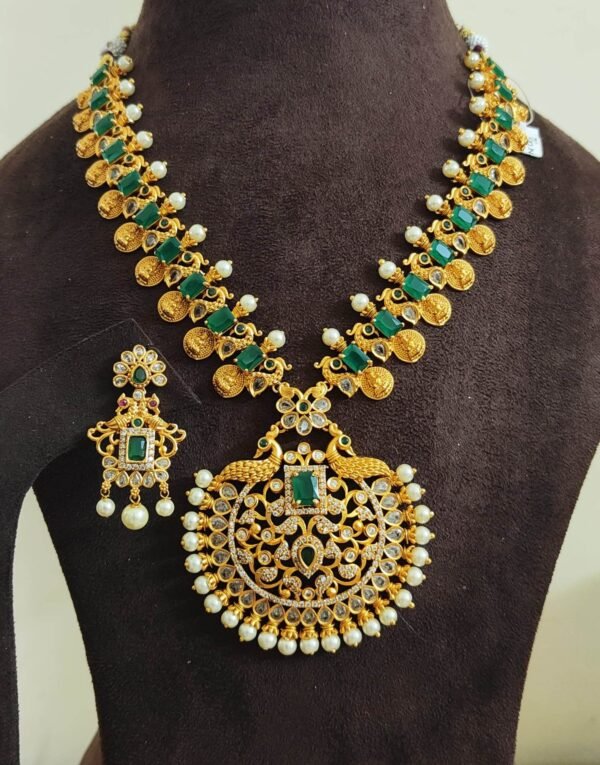 Be the first to review “Kasu necklace designs with emerald stones and peacock model matte finish”