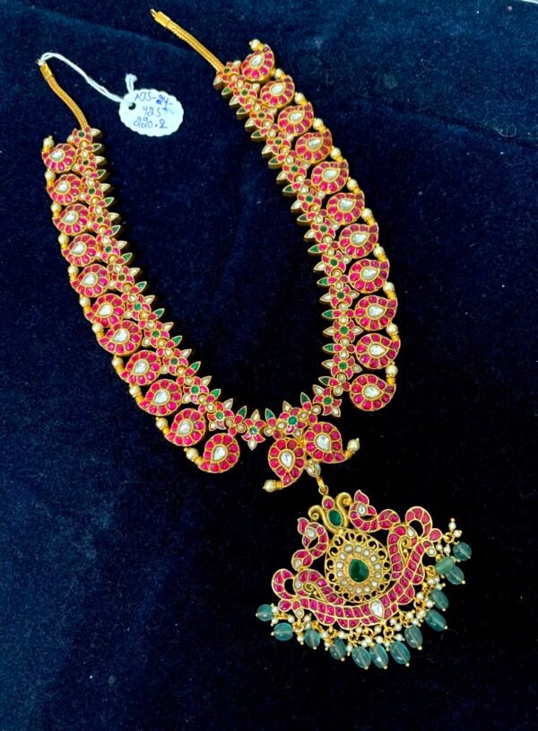 Item Description : Gold polished Silver Kundan haram – Mango design with green bead drops