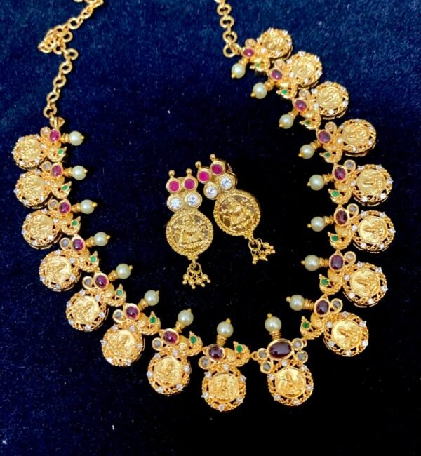 Be the first to review “Lakshmi kasu necklace with pearl drop border”