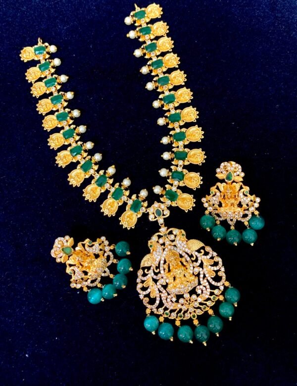 Be the first to review “Lakshmi kasu pendant online emerald stones grand look short model”