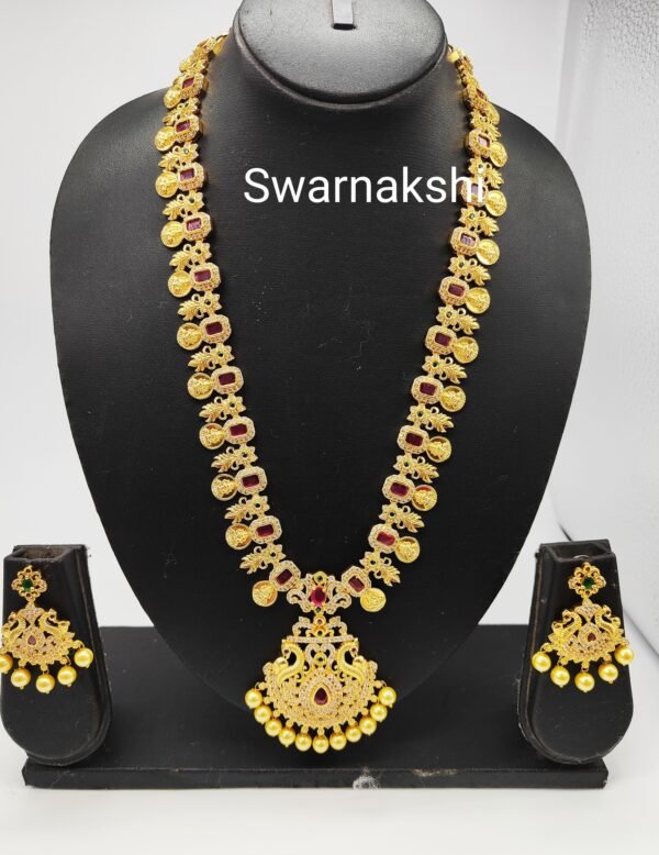 Lakshmi kasu design long haram with matching erarrings long necklace model