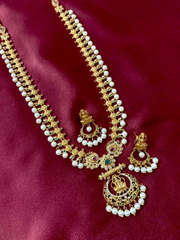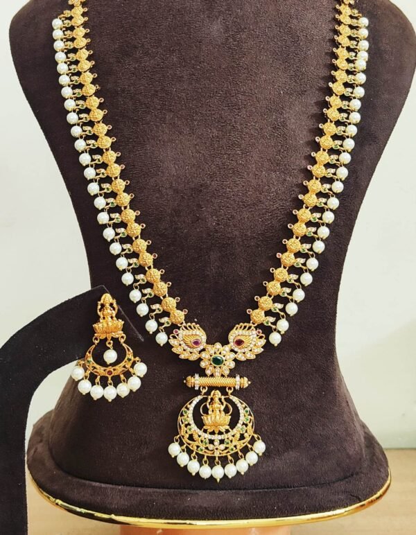 Matte finish lakshmi kasu long haram heavy look design with pearl drops long necklace model