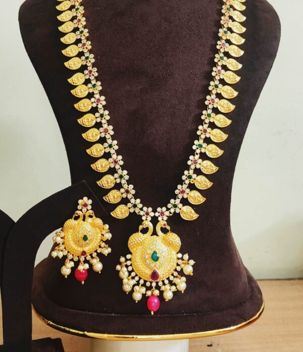Be the first to review “Mango haram designs online with peacock pendant long necklace”