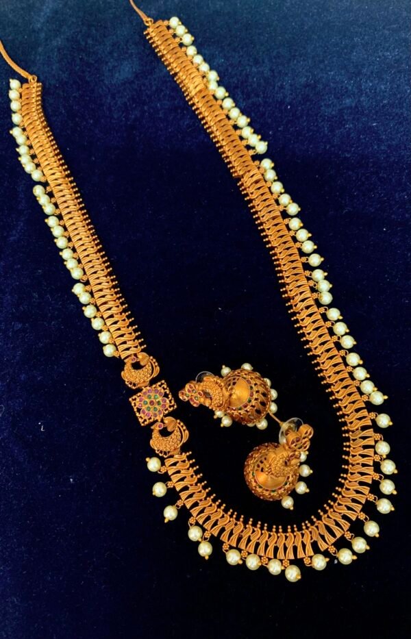 one gram gold long haram with price peacock pendent chain
