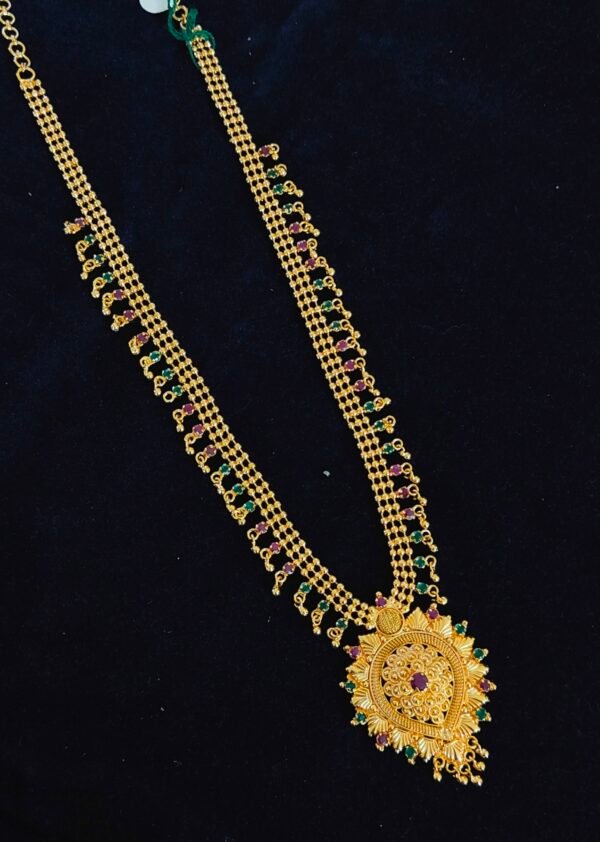 Be the first to review “One gram gold haram design with ruby and emerald stones model long necklace”
