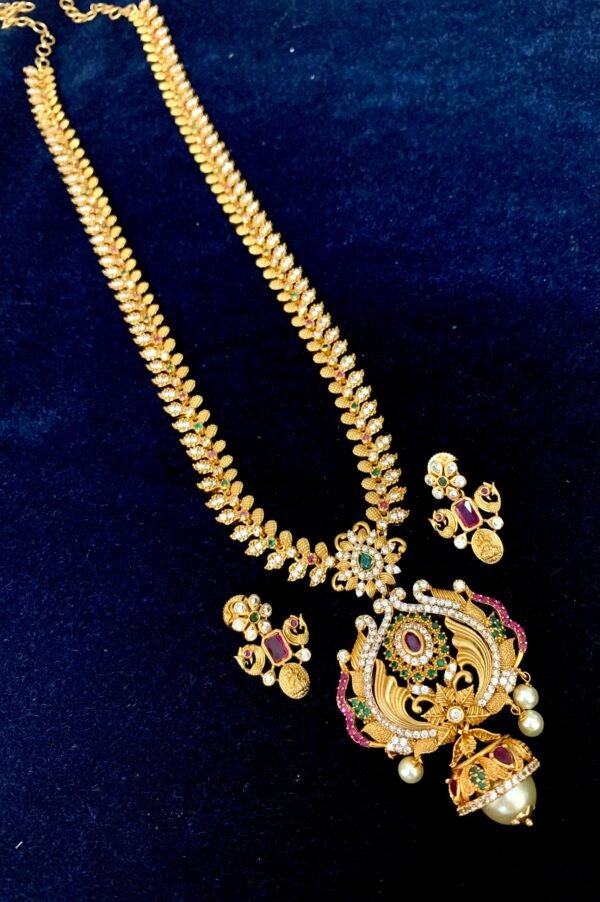 Ruby emerald long haram designs grand look model with big Jhumkas
