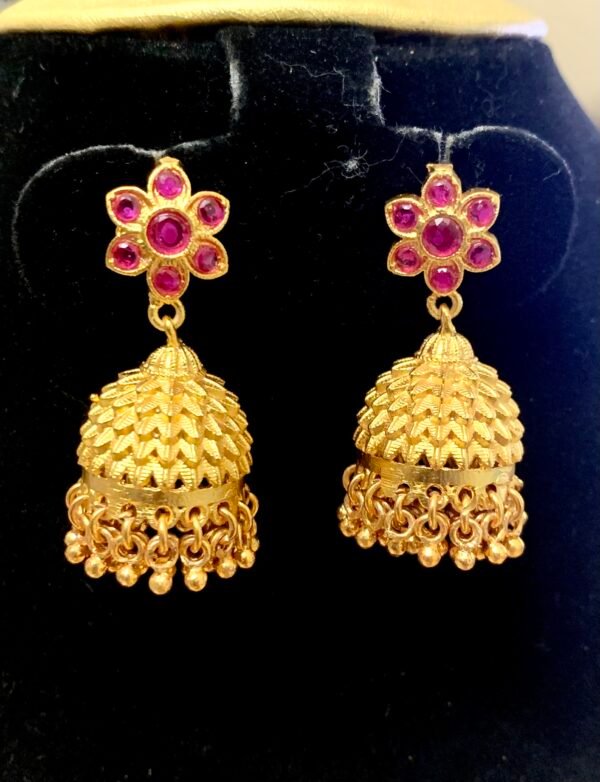 Be the first to review “One gram gold jhumkas with price and ruby stones floral design”
