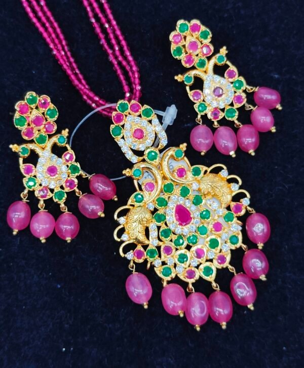 Be the first to review “Pendant set online with ruby and emerald stone model peacock design” Cancel reply