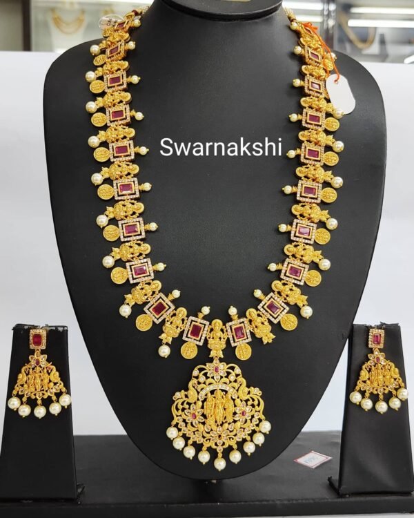 Be the first to review “Ramparivar haram models with kasu design and ruby stones border long necklace”
