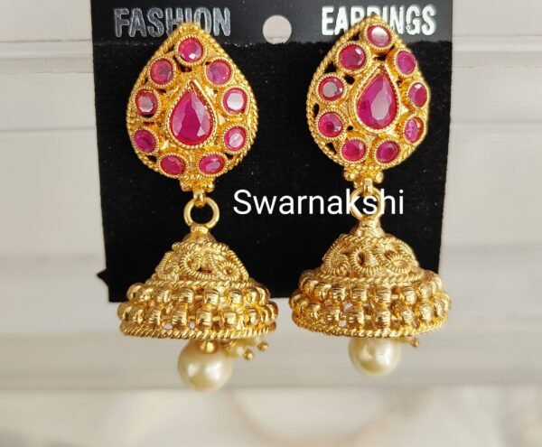 CZ stone jhumkas with ruby stones middle pearl model