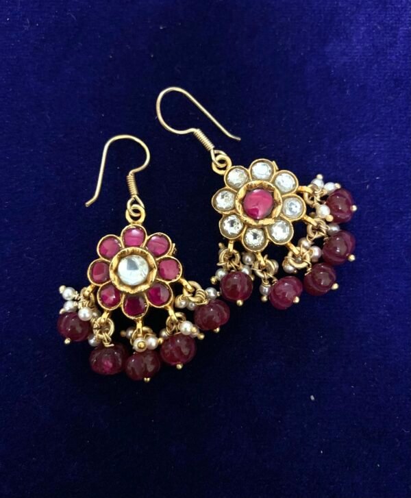 Be the first to review “Gold polished Kundan earring drops ruby and white colour with ruby drops”