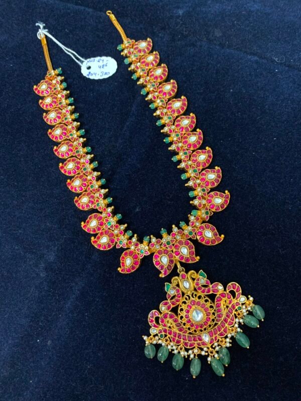 Item Description : Gold polished Silver Kundan haram – Mango design with green bead drops