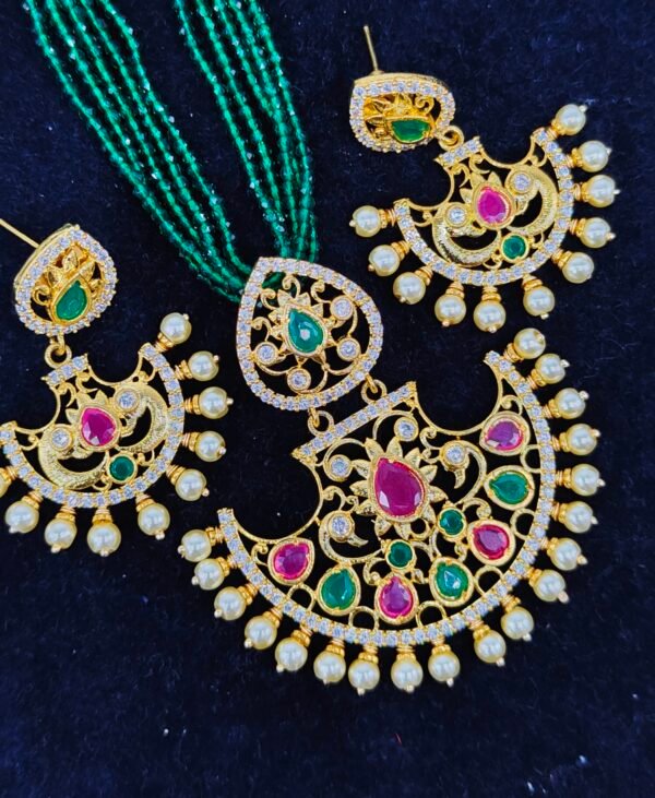 Be the first to review “White pearl chain designs online with large cz pendant and earrings”